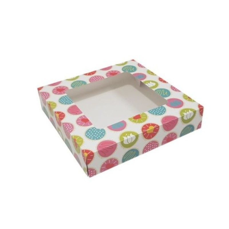 Cutii colorate cu fereastră, dimensiuni 22×22.5x5cm, ideale pentru prezentarea atractivă și protejarea prăjiturilor sau deserturilor delicate.