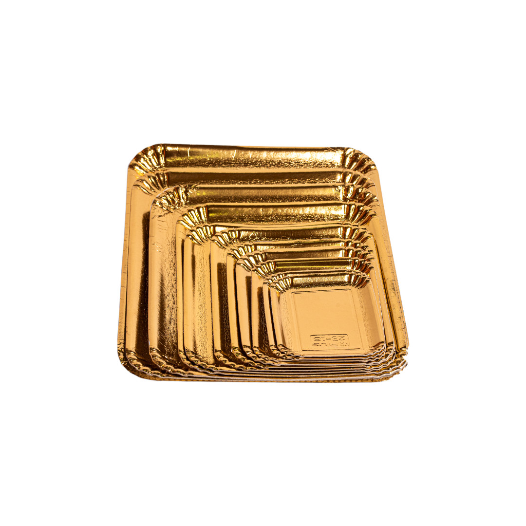 Tăvițe carton LUX aurii 120×180 mm, set 200 buc. Soluție elegantă pentru servirea prăjiturilor și produselor de cofetărie.